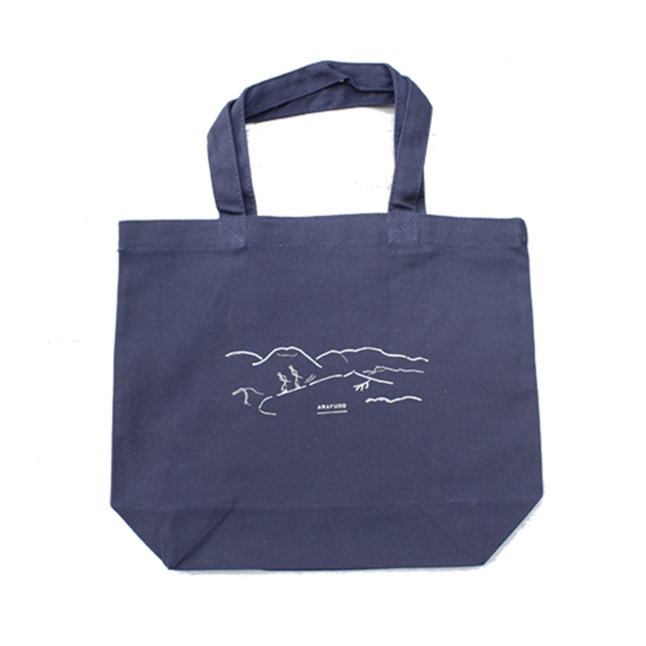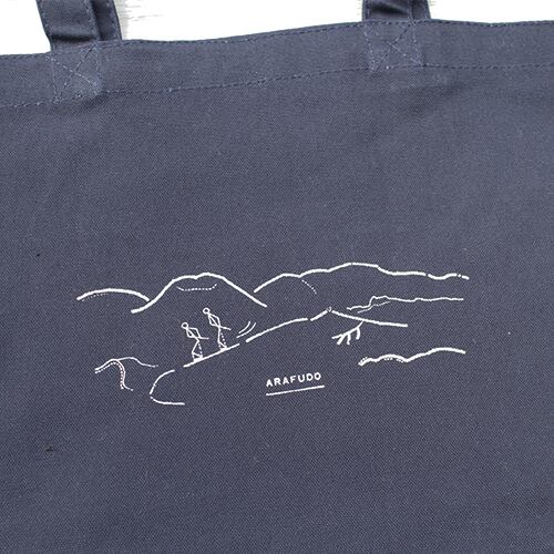 吾妻連峰でスキーをする人のイメージでコラージュし、ちらりと雪が舞い積もる銀世界感を出すべく刷り色はシルバーでプリント致しました。シンプルなモノトーンにデイリーユースにもってこいです。