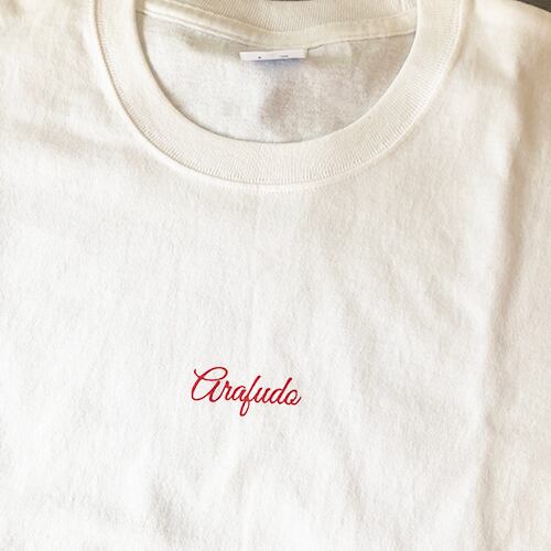 フロント首下にARAFUDOのロゴが小さくプリントされた、厚手生地のTシャツです。